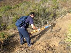 This section had a lot of deep chaparral roots. There are four people chopping out roots in this photo