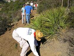 Using a rock bar to pry out part of this group of yuccas that are hanging over the new trail