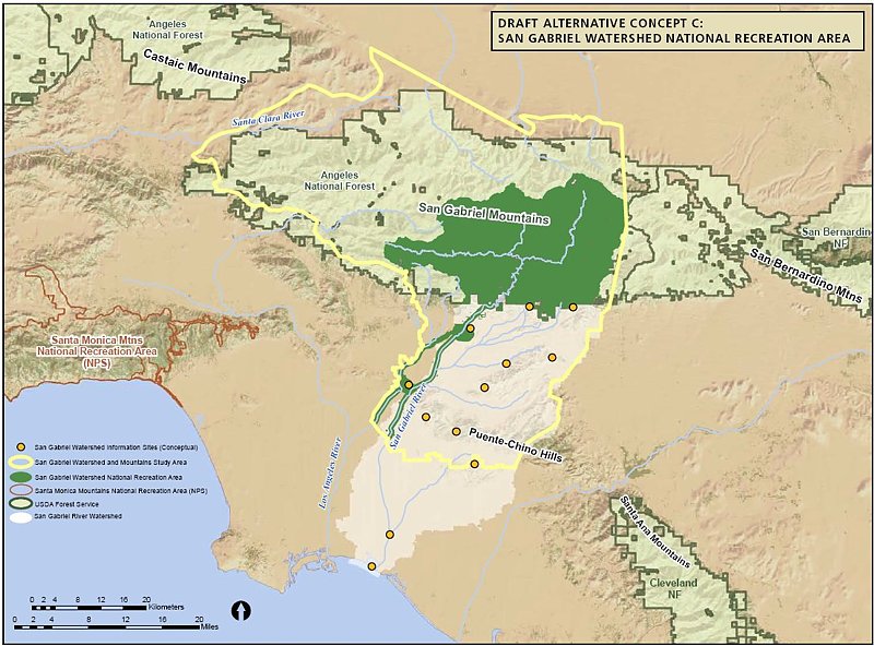 Alternative C would have the NPS taking a leadership role and overseeing a partnership between the FS and the many local land managers. The area would include only the San Gabriel watershed and river corridor. This would exclude most of the current southern Angeles National forest.