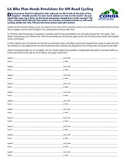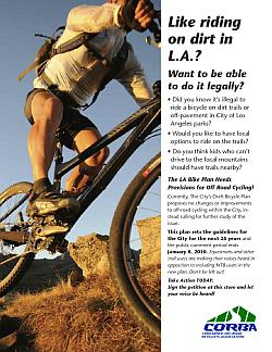 There is a lot more you can do to help. Stay informed. Read up on the plan, CORBA's coverage of the process, and CORBA's Official Response. Send an EmailQuick, Simple. 60 seconds or less, send an email to key City Officials and Cycling advocates. We've written an email for you, but encourange you to add your own perspective to it. Click Here to send your thoughts. Tell your FriendsThe biggest help is getting the word out. Tell your friends about our efforts, and invite them to http://corbamtb.com/campaigns to send their own letters. Especially friends who don't ride, but may be more inclined to if there were more local opportunities. PetitionWe have a flyer and petition available for print. You can print these, take them to your local shop, or just carry a petition with you on your next ride and have your friends sign it. Mail them back to us during the first week of January. LettersWrite and mail your own letter directly to Jordann Turner, 200 N. Spring Street, Room 721, Los Angeles, CA 90012. You can use the text on our letter as a starting point. Snail mail, for all it's inconvenience, still has the most impact. Thanks for taking an interest and for taking a stand. |