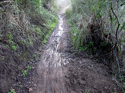 Trail Repair Trashed Many or most of the drainage dips that volunteers constructed during trailwork on the Wood Canyon Vista (Backbone) Trail in Point Mugu State Park last month have been vandalized, de-constructed, and otherwise left ineffective. Downhill ramps were dragged into the uphill dip, greatly reducing their ability to prevent rainwater carving ruts down the middle of the trail. Hopefully this season’s storms will not be so intense that the drainage dips are overwhelmed. Extensive rain rutting will likely require the State Parks to run a Sweco bulldozer up the trail, as they did this spring, which will result in a loose, unstable trail surface that angered so many people at the time. Read the full blog article on this trail damage... Most trails in our local riding area don’t respond well to rain. They have a high content of clay that turns into sticky, slippery muck that binds to everything it touches. Most wet trails don’t respond well to bikers, hikers or equestrians until they’ve had time to dry out. Hikers and horses make holes and ridges in the trail that become as hard as concrete when the trail dries. Bikes make grooves down the middle. These grooves collect water when it rains again, turning first into little channels to move the water downhill, then into little ruts, then large ruts that destroy the trail. You’ve heard about the beat of a butterfly wing that causes a hurricane? Then remember the tire track that turns a tail into one large rut!But if the trails are soaking, all is not lost if you need to ride! There are a few trails that hold up well when wet because they have more sand and rock that doesn’t hold the water. See the full story on our blog... There is no trailwork scheduled for 2011 yet. Check back to our Trailwork web page for updates. To see all trailwork dates, including those of other groups, visit the CORBA trailwork calendar.