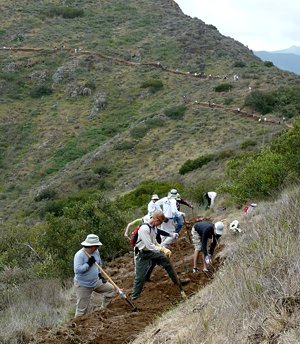 By Mark Langton CORBA Board Member Bennett-Taber Resigns It is with great sadness that we must announce CORBA's Treasurer and one of its Directors, Danusia Bennet-Taber, has resigned her positions due to health concerns. Danusia has been the backbone of CORBA for the past four years, keeping our books organized and up to date. She was also pivotal in navigating the transition to becoming an IMBA Chapter, working diligently with IMBA's IT department making sure our interests were represented. Additionally, for many years Danusia has been deeply involved with CORBA's programs including Youth Adventures, Take a Kid Mountain Biking Day, the Fat Tire Festival, and leading Beginner Rides. She has also been an active and avid member of the Mountain Bike Unit (MBU). We are losing a truly dedicated mountain bike advocate and wish her all the best in her future endeavors. We will "see her on the trails!" For many years, most trailwork has been done by volunteers because of budget cutbacks at our parks systems. So come out and help CORBA and other volunteers keep our trails in top riding shape! You can learn more about what to expect and what you'll need to bring with you on our Trailwork web page. Keep in mind that CORBA now provides prizes and lunch after the event for volunteers who register in advance! And by registering in advance, you'll help us prepare by knowing how many volunteers to expect. If you come out to two or more trailwork days in a year, we'll give you a cool long-sleeved CORBA trail crew shirt - be sure to ask for yours! Report on Guadalasca Trail in Pt. Mugu State Park The March 17th trailwork day was cancelled because of rain. The next Guadalasca trailwork will be on Saturday, April 14, and is described below.