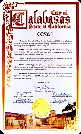 by City of Calabasas Mayor Mary Sue Maurer in appreciation of CORBA’s