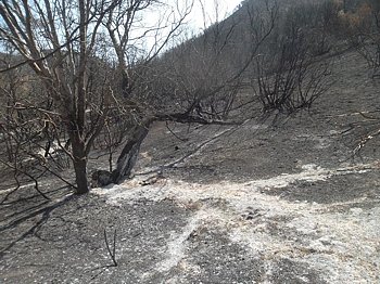 There were a lot of ‘ash ghosts’ on the ground: markings left when whole trees or large limbs had fallen and been completely consumed, leaving a pattern of ash where branches used to be.Fortunately not all the oaks fell to the ground, but too many of them did.