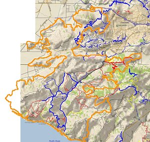 of the burn area (orange) laid on top of a trail map